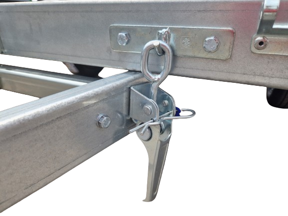 K přívěsu je oj připevněn dvěma uzávěry BV 40 s pojistkou, aby byla distribuce síly co možná nejlépe rozložena. Materiál oje má tloušťku 3 mm.
